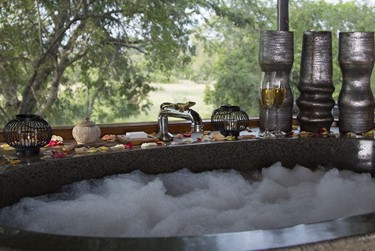 The main Lukimbi Safari Lodge building welcomes you with its sweeping staircase and artistic fireplace with creatively engraved animals. Our tasteful lounge overlooks the Lwakahle River where animals often come to drink, and the bar nearby has an award-winning wine list and cellar. No detail has been omitted in our unusual African boma, a favourite outside fire-lit venue. We also move our tables around in and outside our elegant restaurant and on our stunning deck, so you can enjoy different views on different days – a detail our guests often remark upon. Our library has a collection of both non-fiction and fiction available to guests as well as a computer station for their use.