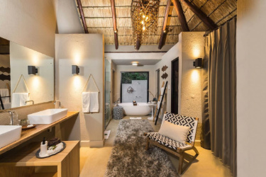 Each thatched suite is individually styled with a designer bed, draped mosquito nets, genuine African artefacts, wooden finishes and creative use of colours, textures and light. Luxurious en suite bathrooms feature both indoor and outdoor showers, while the new heated spa bath on each secluded deck offers a delightfully decadent vantage point from which to relax and watch the bushveld and abundant wildlife.